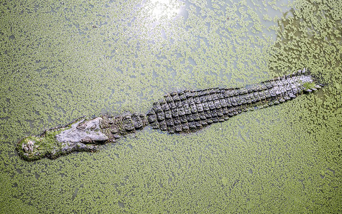 Alligators like to float just beneath the surface of the water, with only their eyes and nostrils breaking the surface of the water. The rest of their big body just relaxes underneath the water, legs spread apart and the huge tail hanging partway down. The alligator can float at exactly the right level by using his lungs as a kind of inflatable raft, and keeps just the right amount of air for only his eyes to stay above the water. An alligator stays mostly under water for one of two reasons.